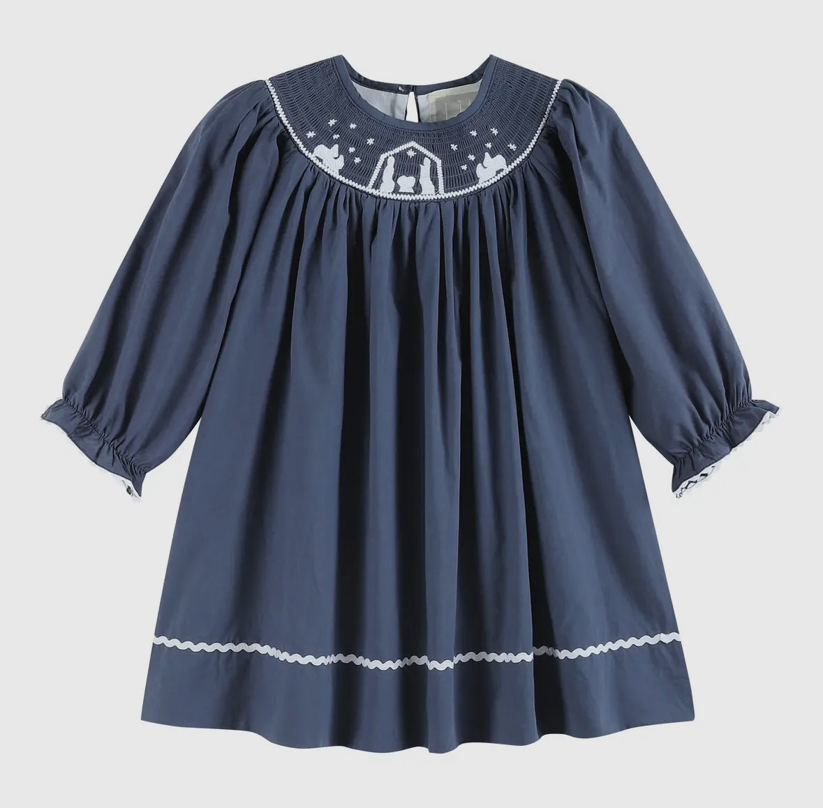 Navy Blue Nativity Long Sleeve Smocked Bishop Dress